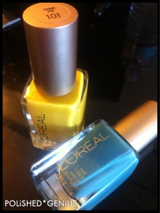 I found a new polish display at CVS for Loreal. Lots of new core colors. I picked up two colors. Tweet me is a beautiful canary yellow with golden shimmers & now you can sea me a nice dusty sea foam blue.